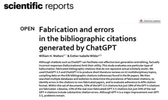 2023년 Nature의 연구에 따르면, 42개 주제에 대한 문헌 리뷰를 생성한 결과, 총 636개의 인용 중 상당수가 실제 존재하지 않는 논문 또는 출처로 확인되었습니다