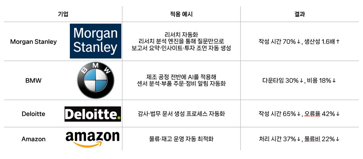 Morgan Stanley, Amazon 등의 글로벌 기업도 일부 부문에서 이러한 접근을 도입해 효과를 보고 있으며, 국내 기업 역시 이를 참고함으로써 반복 업무 자동화, 분석 효율 향상, 의사결정 지원 고도화와 같은 변화를 기대해볼 수 있습니다.